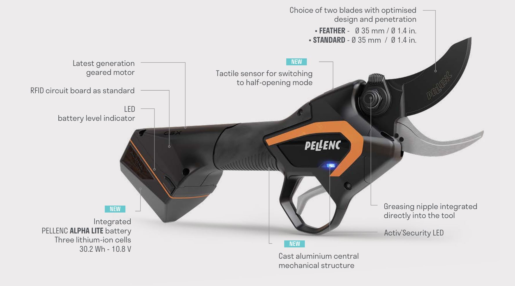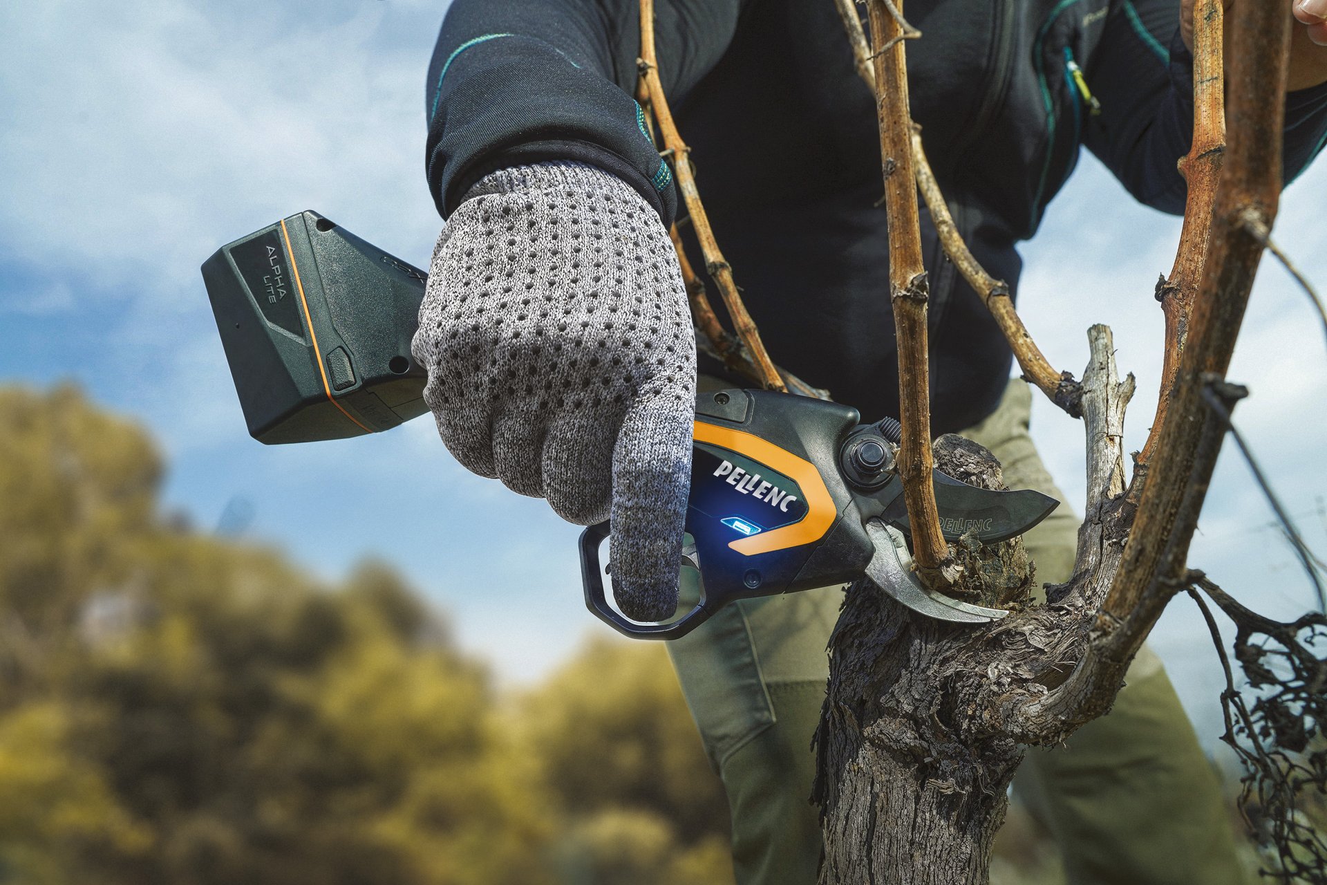 The first pruning shears with an integrated battery for professional users, manufactured in France. Meeting the needs of a market that is evolving, this tool offers freedom of movement and exceptional efficiency! These new pruning shears are the first to be Internet-connected thanks to an NFC connection as standard that enables adjustment of the settings and the uploading of statistical data to the PELLENC Connect Lite smartphone app. Compatible with ANDROID and IOS, the smartphone app is available for download from Google Play or the App Store.